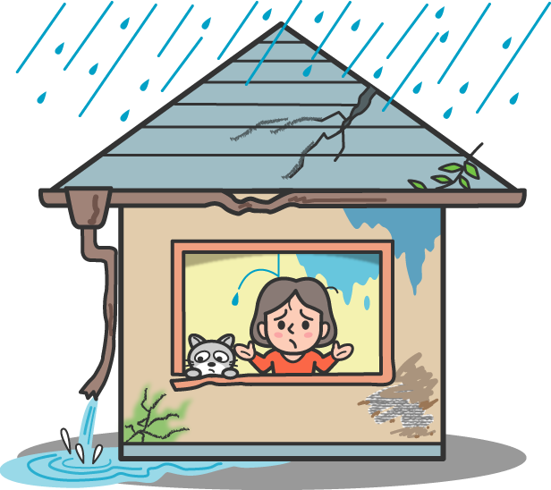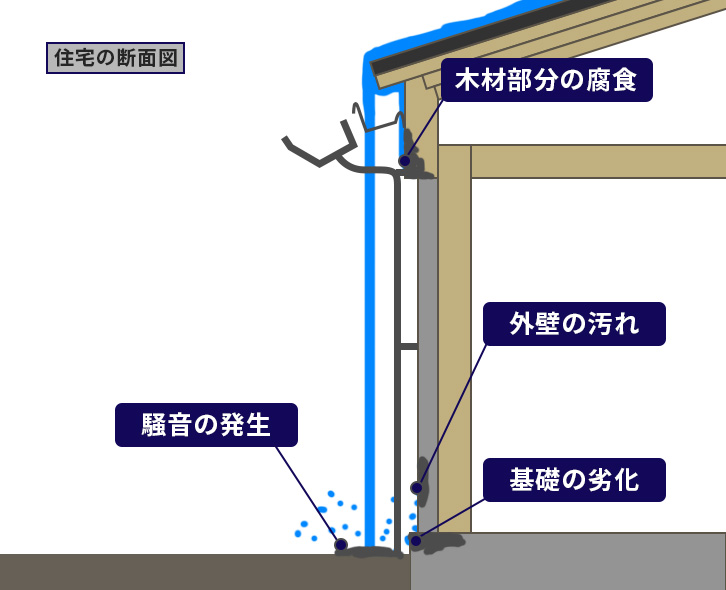 水は屋根裏や雨樋の金具をつたい木材部分を腐食していきます。雨水にさらされることが多くなると、建物自体の湿度が上がります。これによって住宅内にカビが生えることが考えられます。また湿度が上がると、シロアリが住みやすい環境になります。そのためシロアリの被害が発生する可能性があります。