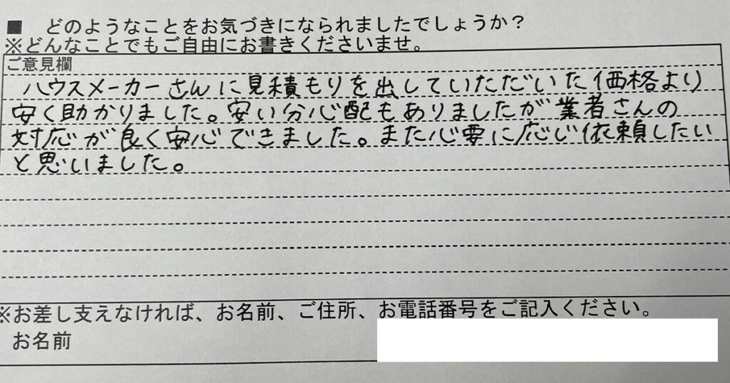ハウスメーカーさんに見積を出して頂いた価格より安く助かりました。安い分心配もありましたが業者さんの対応が良く安心できました。また必要に応じ依頼したいと思いました。