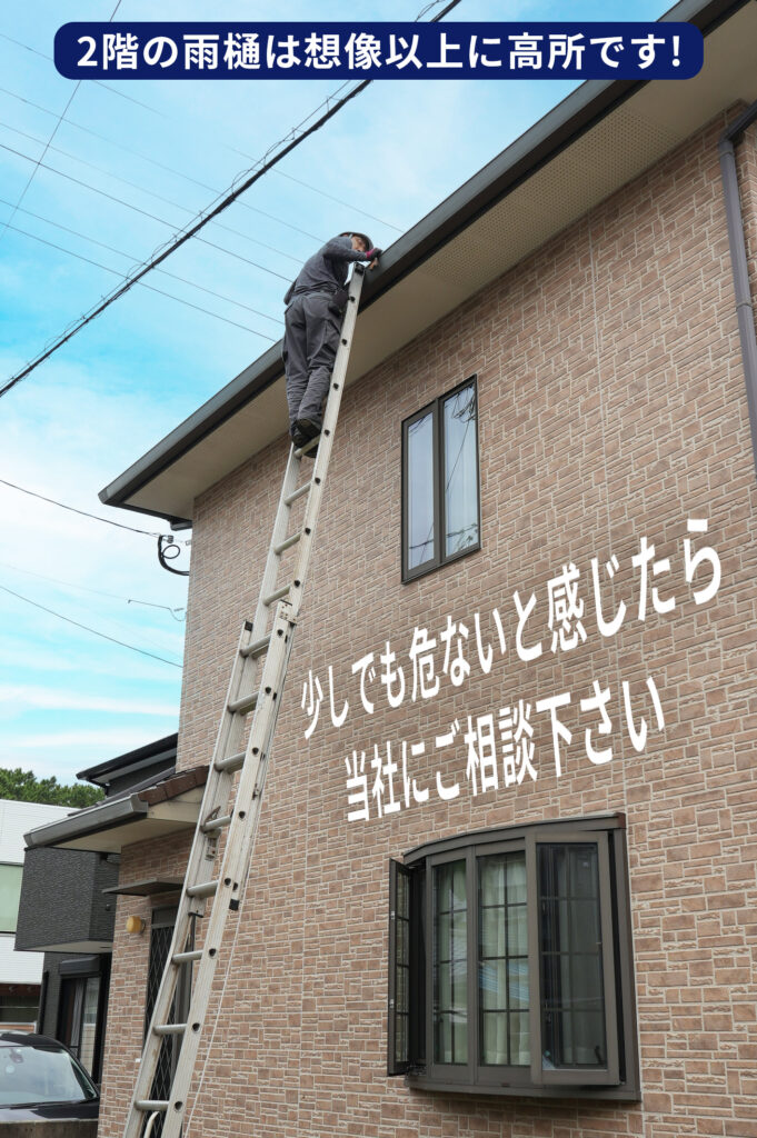 当社は雨樋修理の専門業者として、日々たくさんの現場で作業しており高所作業に精通したプロ集団です。ご自身でやられて、少しでも危ないなと感じた場合、私たちにお任せください。