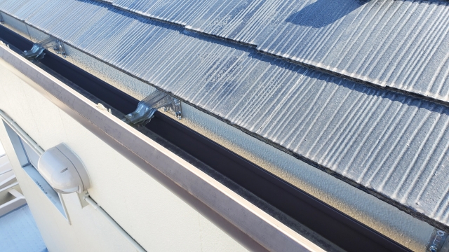 雨どいを固定している軒樋金具も必要に応じて取り外します。排水するために適切な勾配が必要になりますので、水糸を張り、その位置に正確に軒樋金具を取り付けていきます。