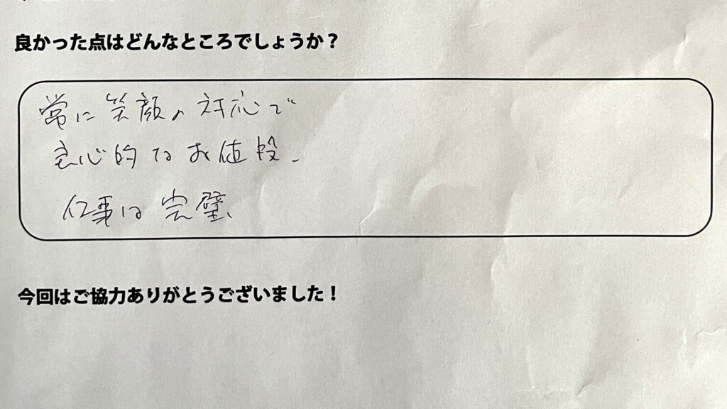 作業前後の違いを写真で見せてくれて納得感のある仕事でした。また機会があればお願いしたいです。