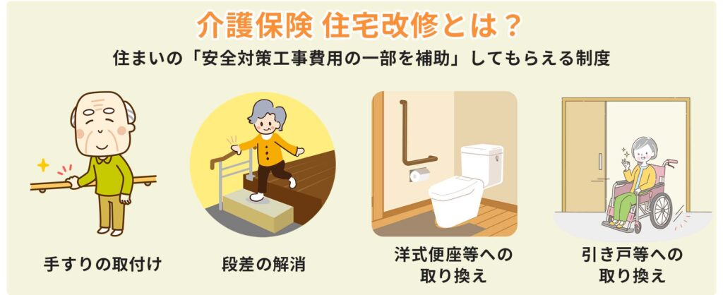 介護保険を利用して住宅に手すりを設置する等の「安全対策工事費用の一部を補助」してもらえる制度です。